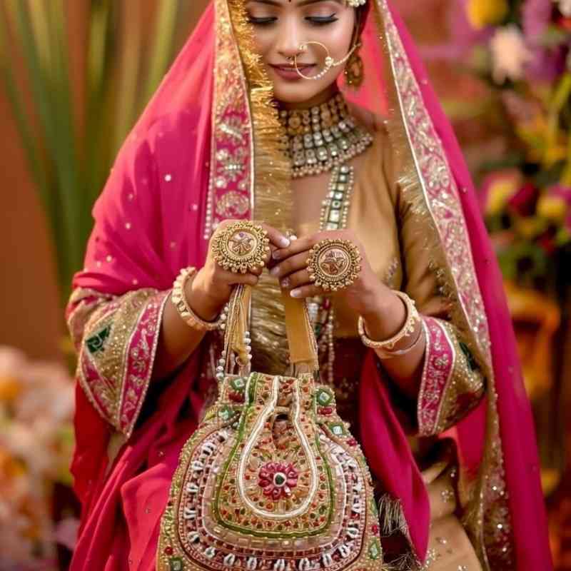 Whether for the wedding day, reception, or bridal functions, this bridal potli bag adds charm, elegance, and tradition to every bride’s look.
