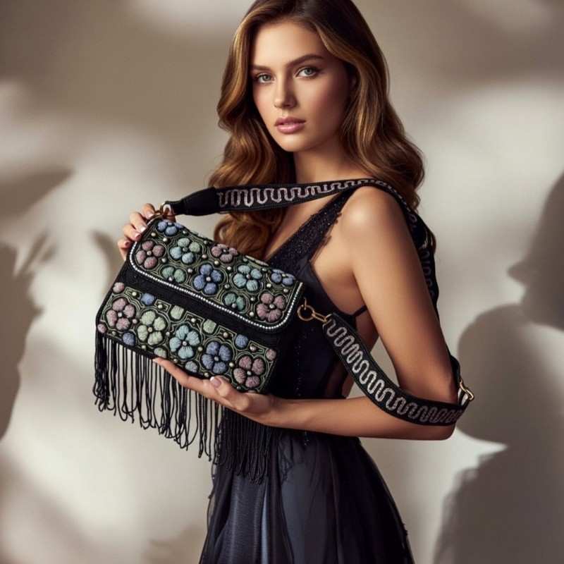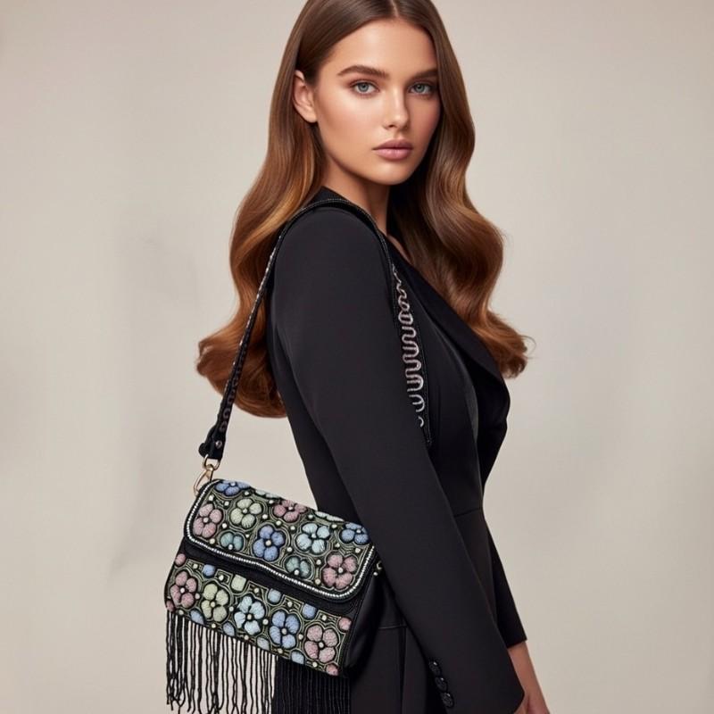 Turn heads wherever you go with our Black Floral Beaded Fringe Party & Evening Sling Bag for Women. Designed with exquisite floral bead embroidery and finished with flowing fringe tassels, this designer handbag brings luxury and charm to every look. The rich black base highlights the colorful floral patterns beautifully, making it a perfect accessory for evening wear, cocktail parties, weddings, and festive celebrations.