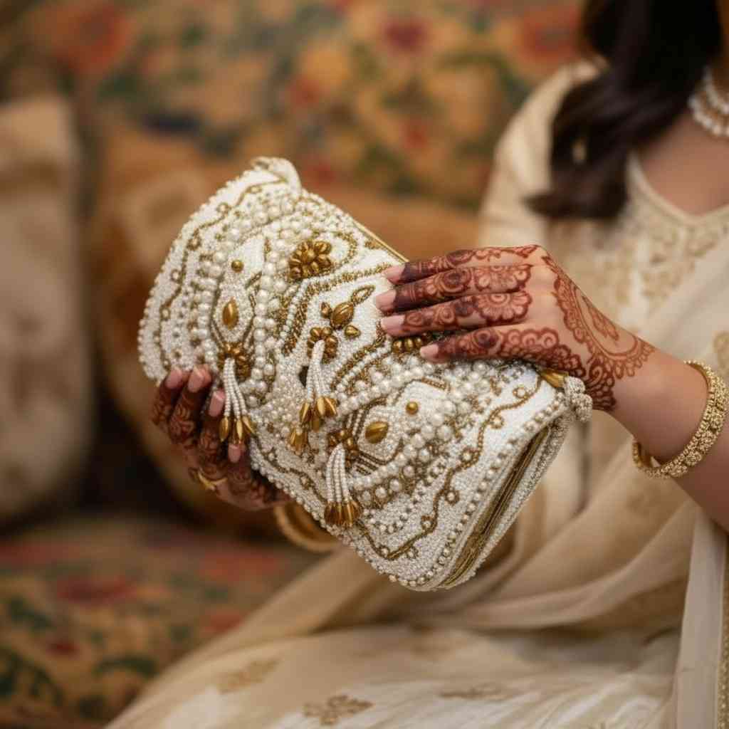 Luxury Wedding Bridal Bag for Lehenga – Pearl Embroidered Designer Bridal Handbag