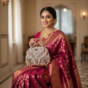 Add elegance to your wedding look with this beautiful designer pearl bridal clutch bag for wedding, specially created for modern brides. This stylish bridal wedding clutch bag features detailed pearl and bead work that gives a luxurious and traditional appearance. The elegant design makes it a perfect bridal bag for Indian wedding, suitable for bridal lehenga, saree, and reception outfits.