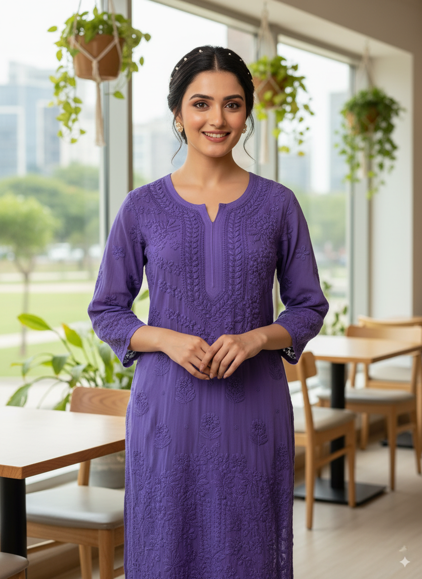 Add a touch of grace to your ethnic wardrobe with this dark purple embroidered kurti for women. Designed with intricate thread work, this cotton long kurti combines comfort and style, making it perfect for daily wear, office wear, and festive occasions. The straight fit kurti with 3/4th sleeves features delicate floral embroidery on the front, giving it a traditional yet modern look. Pair this purple kurti with leggings, palazzos, or jeans for a versatile outfit.