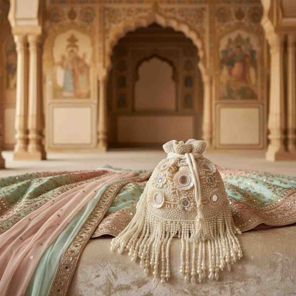 Explore our premium designer bags for women, featuring handcrafted pearl embroidery and elegant ivory detailing. This luxury designer handbag is perfect for weddings, receptions, and festive occasions.