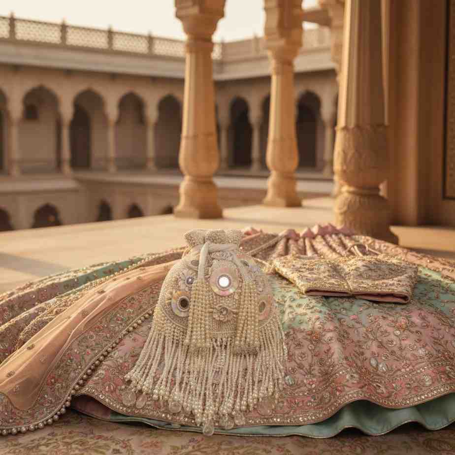 Designed in a soft ivory / pearl white / off-white shade, this bag perfectly complements bridal lehengas, sarees, reception gowns, and pastel wedding outfits. The neutral champagne-toned base makes it easy to style with both traditional and modern attire.