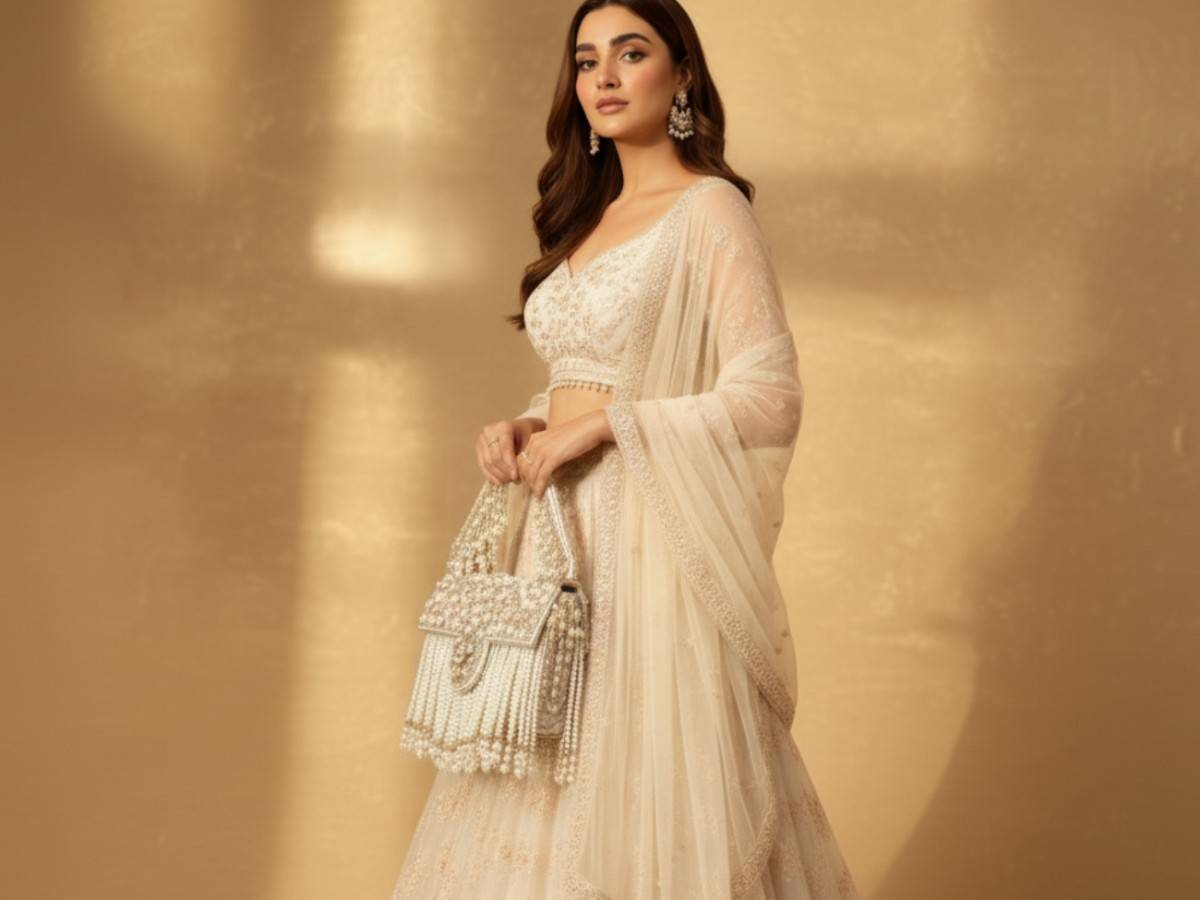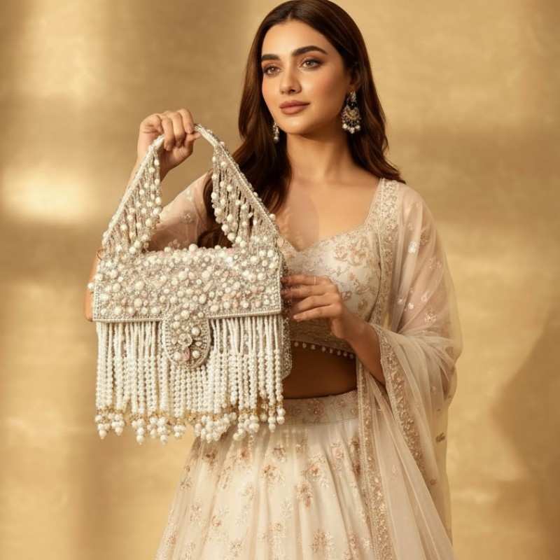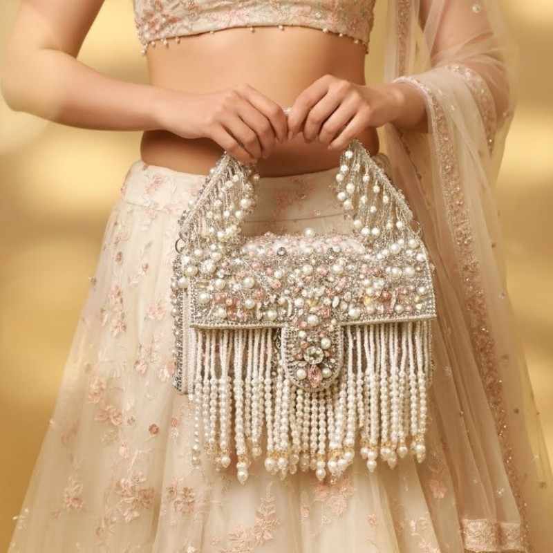 The flap closure adds a classic touch while keeping essentials secure, making it as functional as it is glamorous. Every detail reflects fine craftsmanship, making this handbag ideal for brides, wedding guests, and festive occasions where elegance is essential. Whether paired with traditional attire or modern fusion wear, this pearl fringe bag instantly elevates your look with timeless charm.