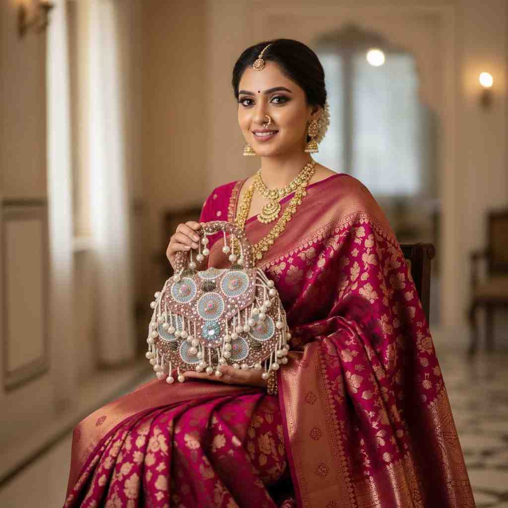 Elegant Pearl Bridal Bag for Saree – Handcrafted Wedding Clutch